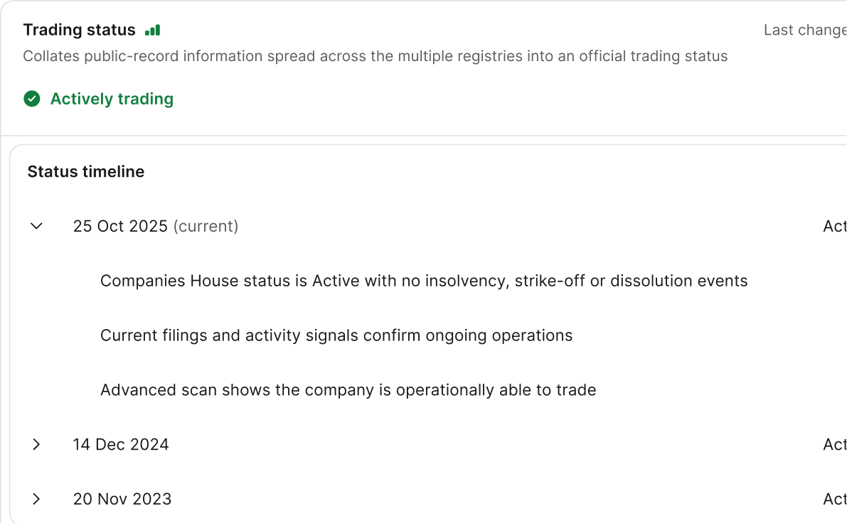 Search any legal entity and see the essentials instantly — trading status, location, incorporation, and activity.