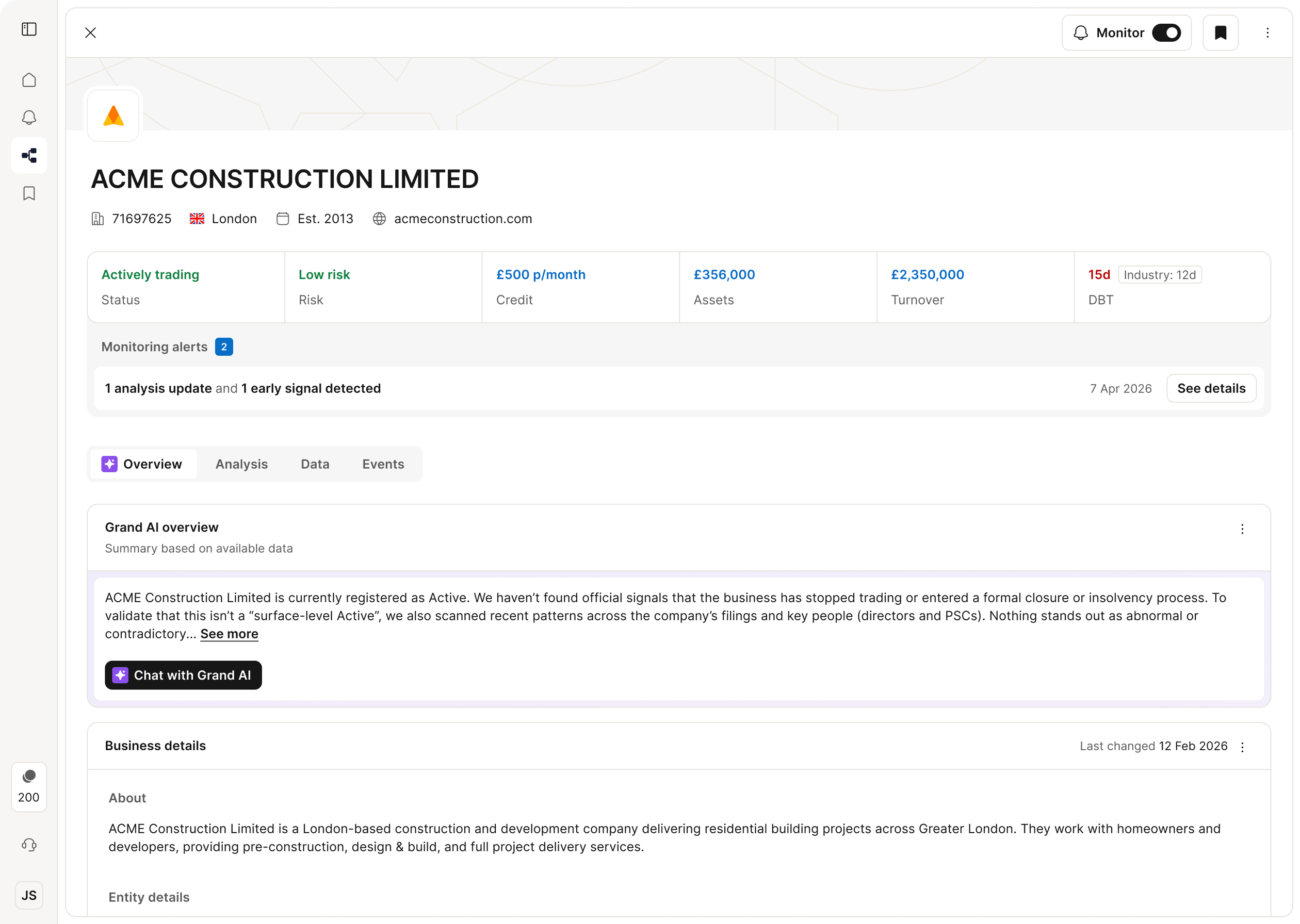 Grand analyses a range of trusted business data sources, including official registries, financial filings, compliance databases, and other verified information used to assess commercial risk.