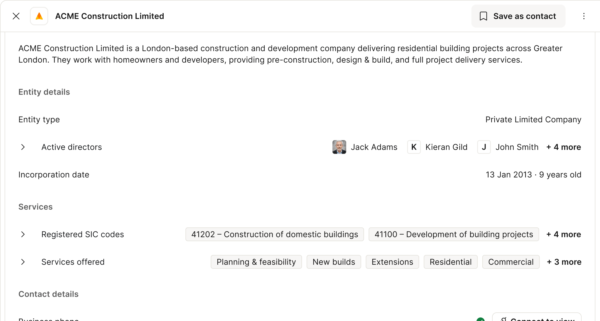 See how a trade partner is structured — active directors, ownership, entity type, registered address, and company group.